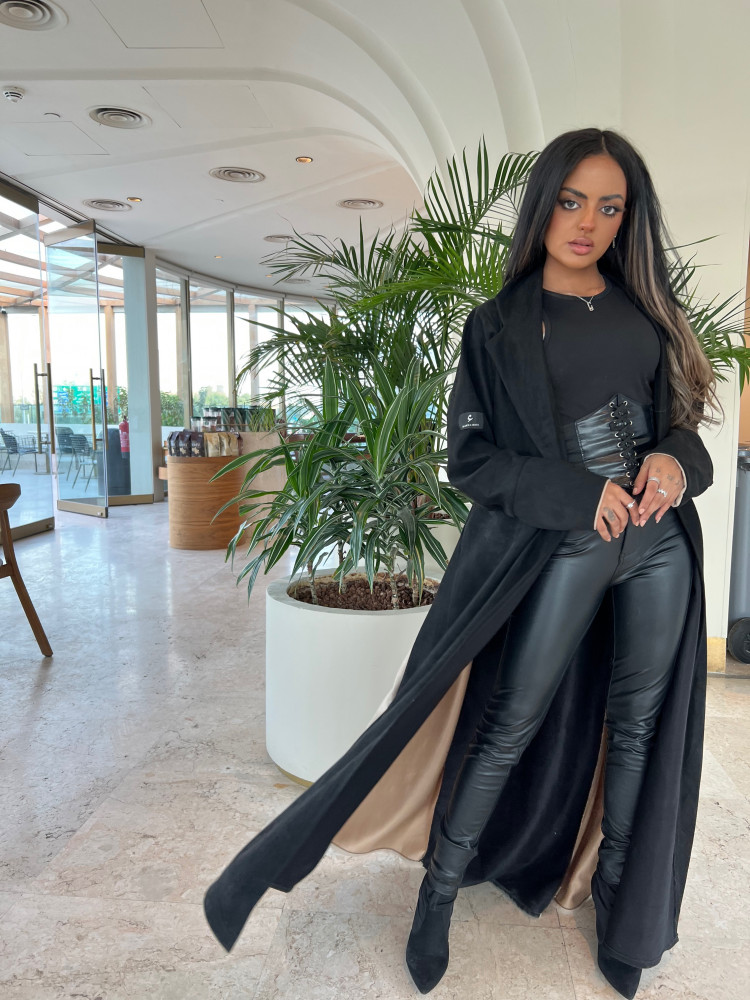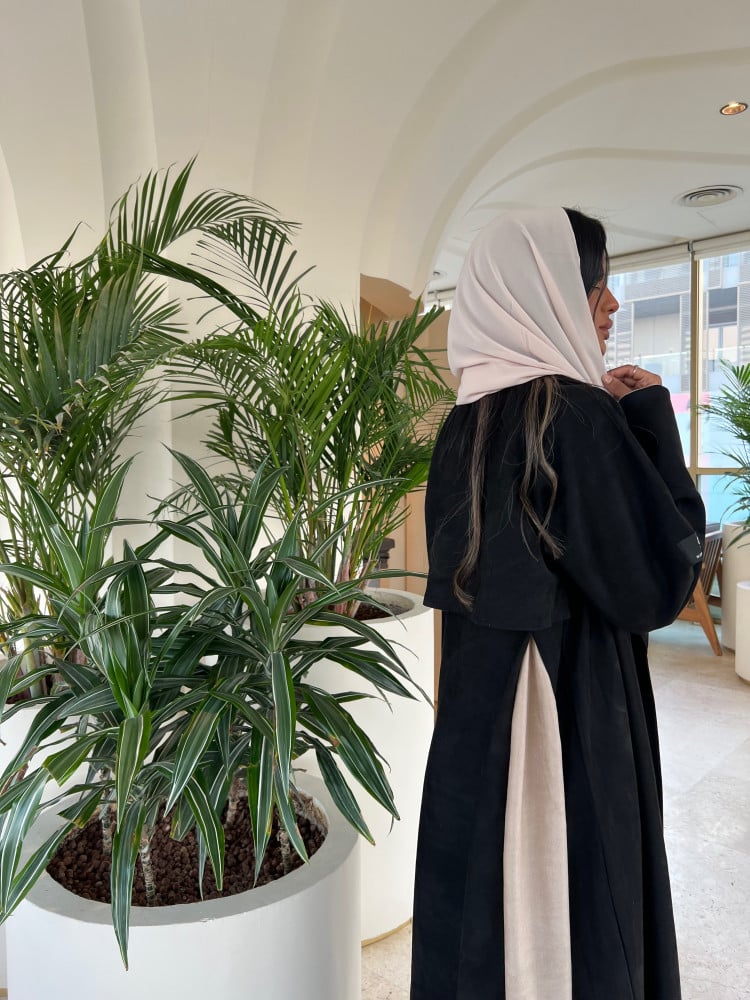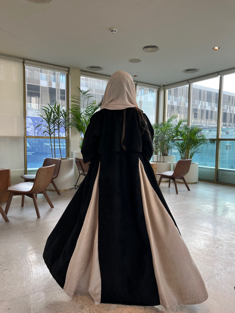 عبايه شتويه شامواه اسود بكسرات جانبيه لون بيج وقصه خلفيه مربعه مع اكمام قصه عاديه بتبطين بيج داخليشامله طرحه لون بيج✨
