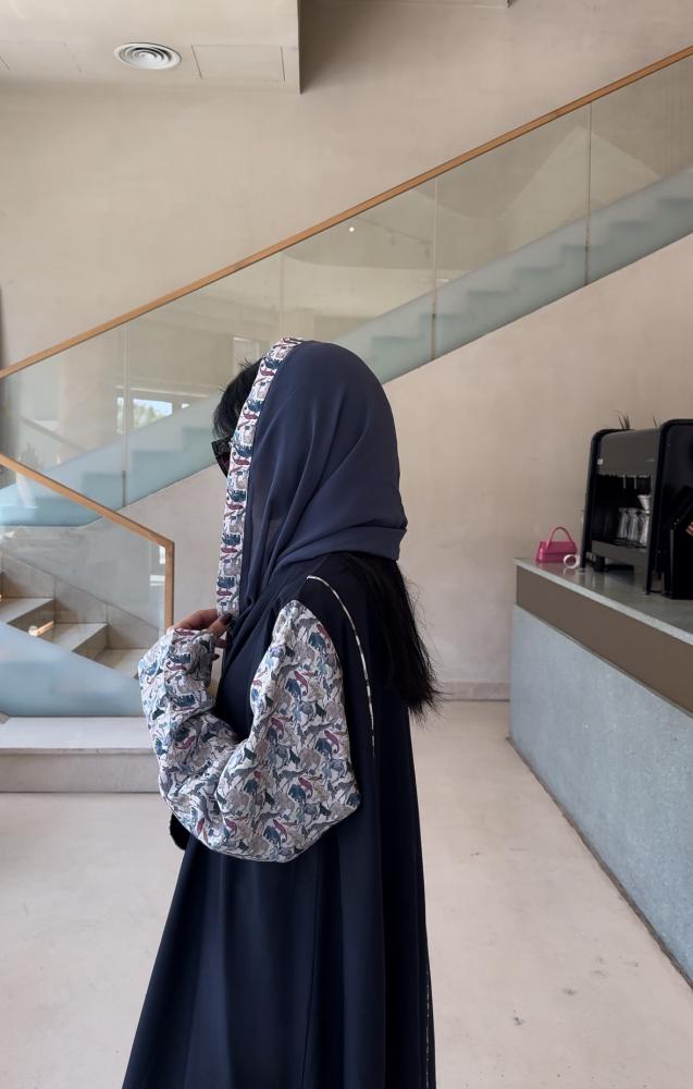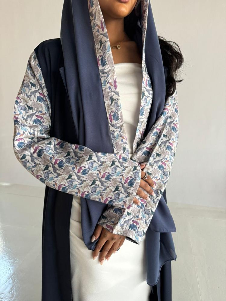 عبايه نصف كلوش لون كحلي قماش كريب باكمام لينن طبيعي برسمه حيوانات متنوعه 🐘🦒 يزين العبايه من الخلف ثلاث خطوط ليين مماثله للرسمه الاساسيه