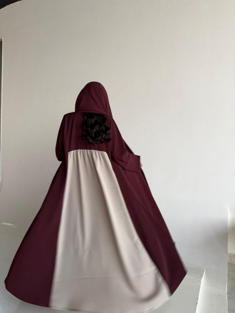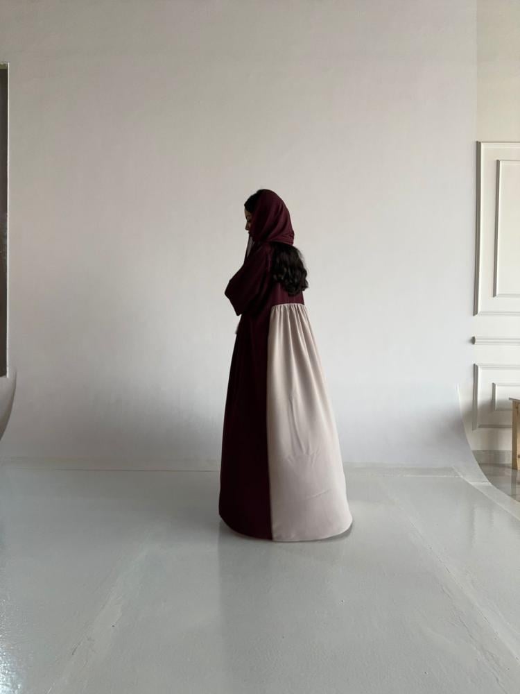 عبايه نصف كلوش لون عنابي بتداخل من الخلف باللون البيج و باكمام ضيقة وفتحة كم مبطنة بلون بيج.
