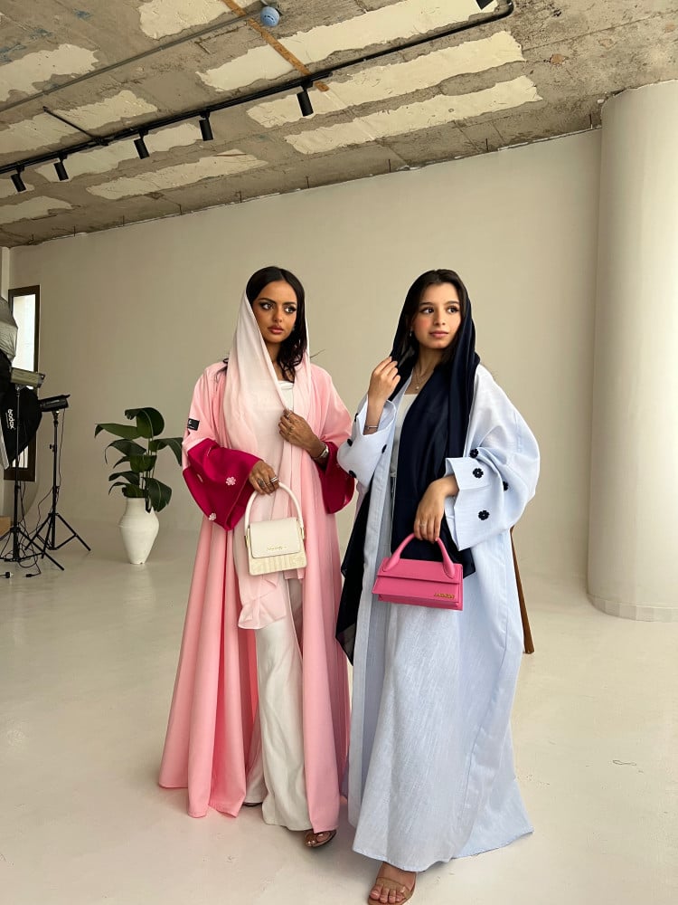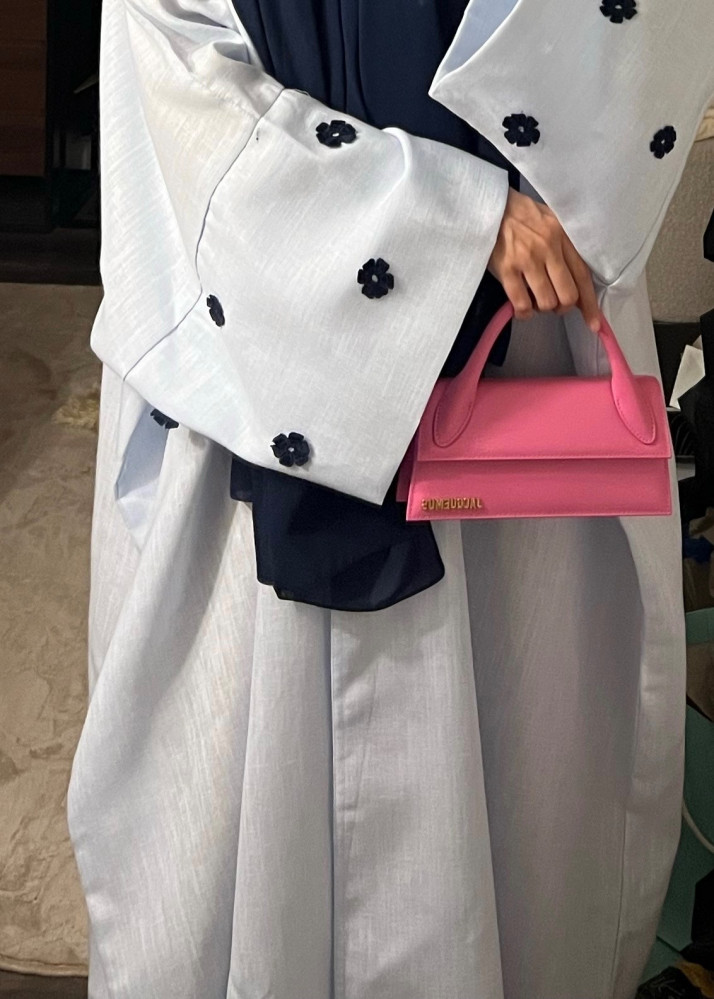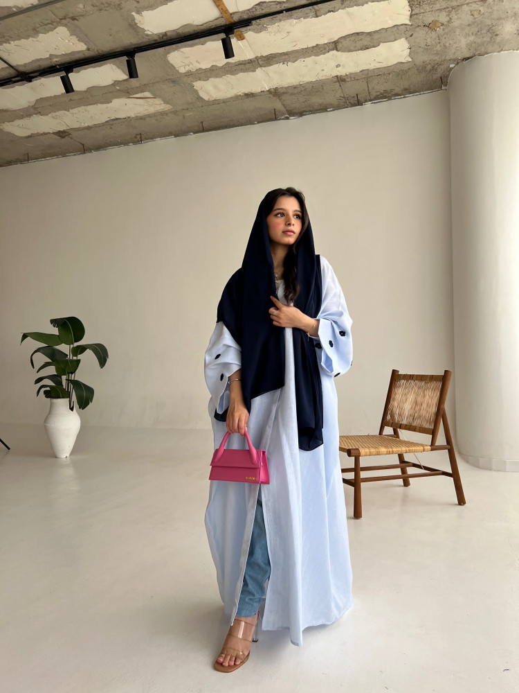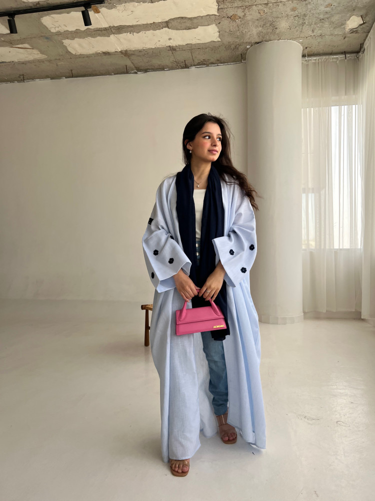 عبايه نص بشت لينن لون سماوي فاتح باكمام واسعه و ورد كحلي باحجام متفاوته شامله لطرحه لون كحلي ☀️💙